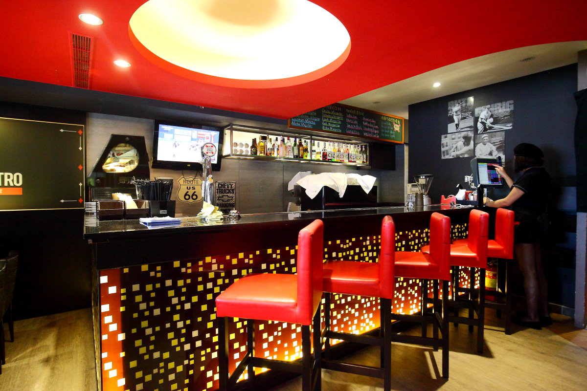 Bangles Bistro 班格斯西式餐館的用餐區域十分寬敞舒適,紅黑色調裝潢加上許多美式搖滾風格元素,還有設置吧檯的位置,牆上設置了液晶電視,撥放著美國大聯盟MLB的賽事,氣氛讓人感到十分輕鬆休閒