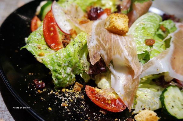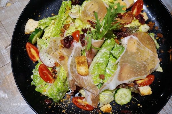 先送上配色繽紛漂亮的經典凱薩沙拉配西班牙帕瑪火腿