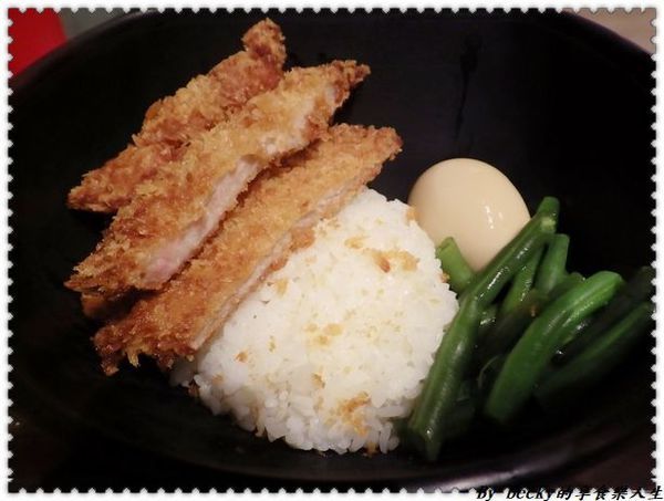 這裡是咖哩醬汁與飯及豬排分開置放,而配菜則是四季豆及溏心蛋。