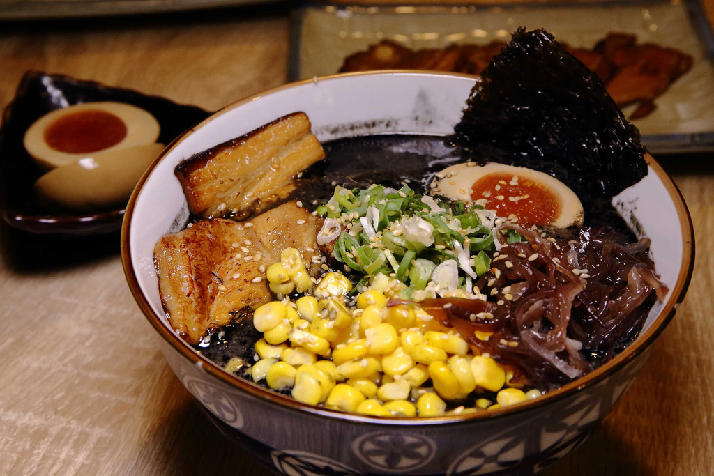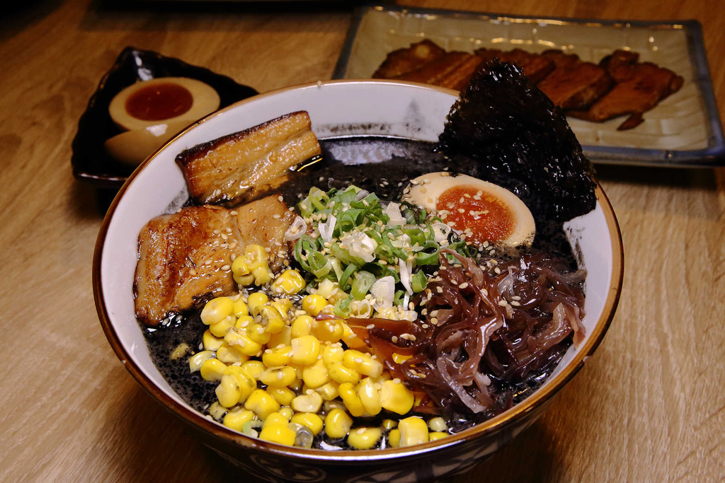 端詳整碗拉麵,黑色的湯頭,是用墨魚汁還有數種味增醬為基底熬煮製成