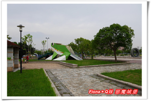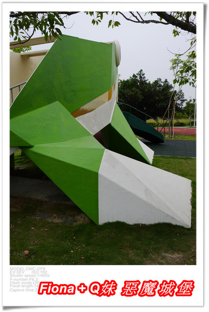 樹蛙前方有兩片樹葉設計成的溜滑梯,一片是階梯,另一片是溜板,滑梯小小的十分袖珍,高度也不高,蠻適合小小孩的,不過滑下來的葉面比較寬,玩的時候大人還是要多加注意,不然容易滑落太快而翻倒喔 !