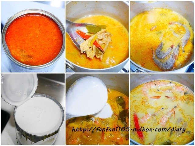 將海鮮湯倒入鍋中,海鮮湯內的配料有香料、還有洋菇、加入適量鮮蝦再加入50克的椰漿煮滾後即完成