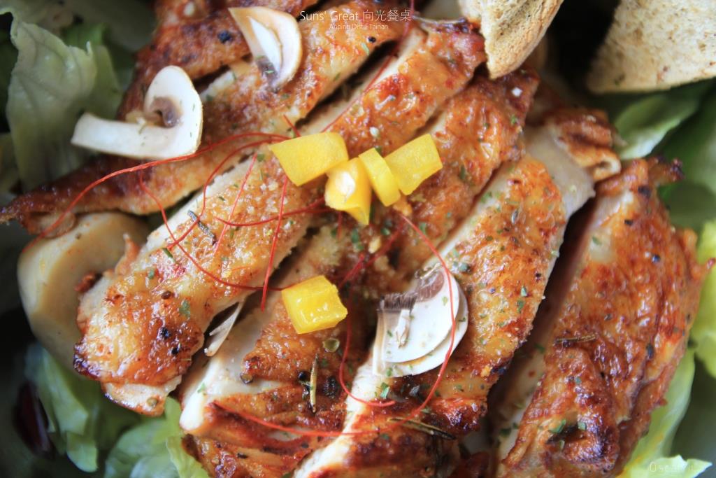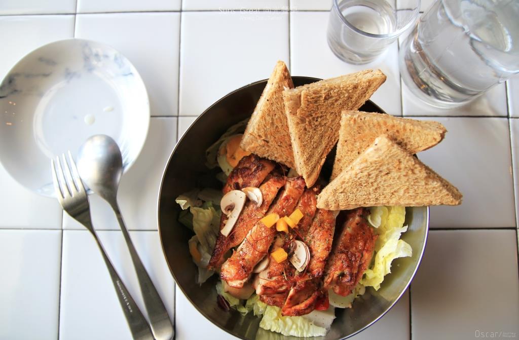 大量的溫生菜沙拉、莫札瑞拉三明治與赤皮烤雞腿排 將鋼盆盛滿 視覺上看起來相當滿足