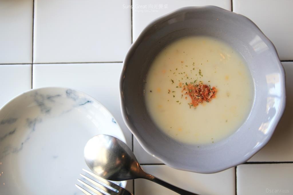 湯底是相當濃郁的玉米濃湯 店家在湯品上撒上了些許煸乾的香酥紅蔥頭