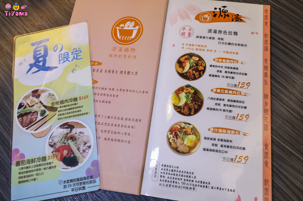 源湯將補氣的「漢方湯頭」加進餐點裡,設計出多樣化的料理,強調不加任何火鍋粉、味精、大骨粉…等人工香料,有平日限定的燉盅、冷麵,還有拉麵、煲鍋、火鍋。