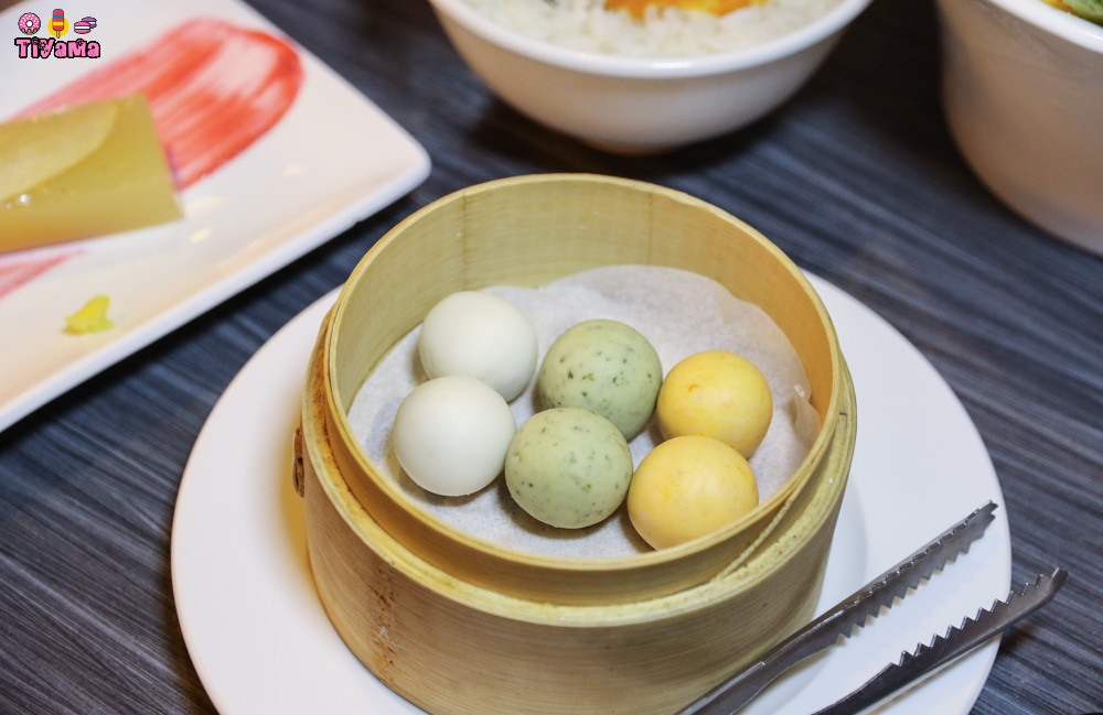 「苦瓜湯圓」是店內手工招牌,從左而右 分別為:苦瓜(白)、山苦瓜(綠)、南瓜(黃),配色滿分看起來很可口,放在小蒸籠好吸睛…連緹緹也直說想要吃