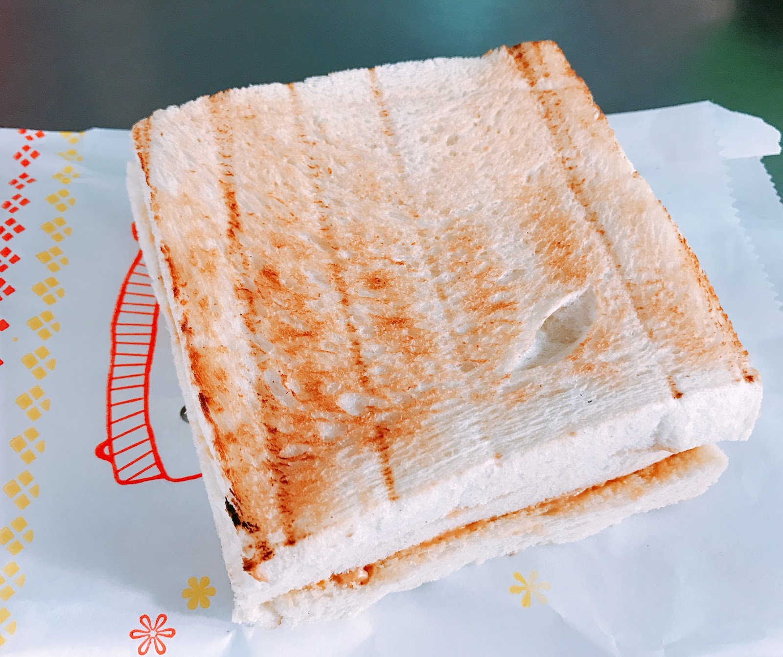 吐司片是三層,上面塗抹著滿滿香濃顆粒花生醬