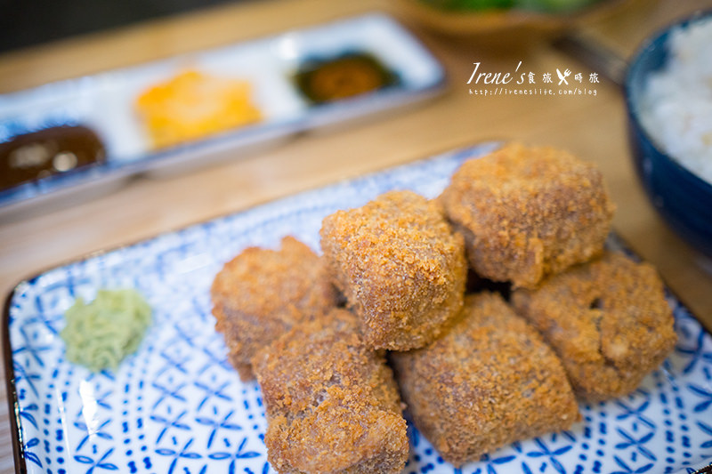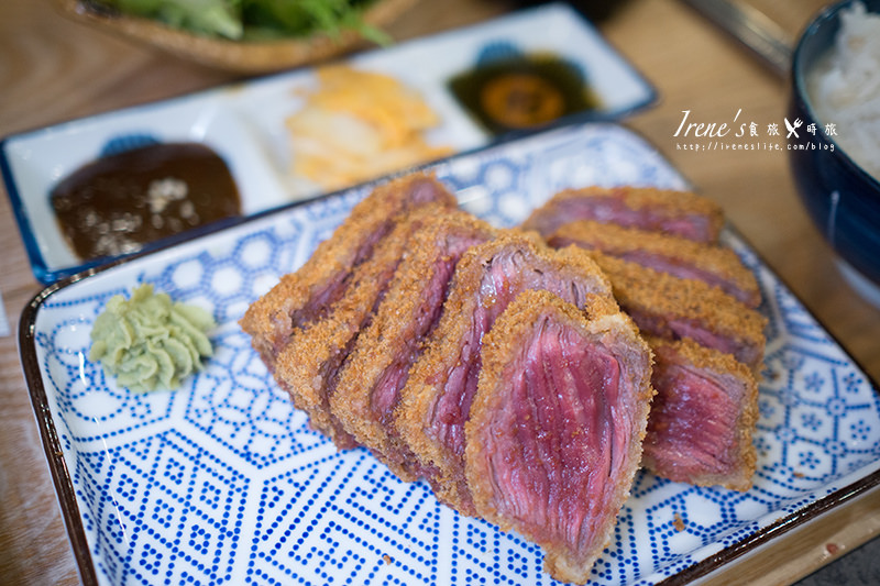 吃法可佐芥末、梅子醬油、味增醬,跟在日本勝牛吃的時候一樣,蠻喜歡炸牛排跟芥末的搭配,