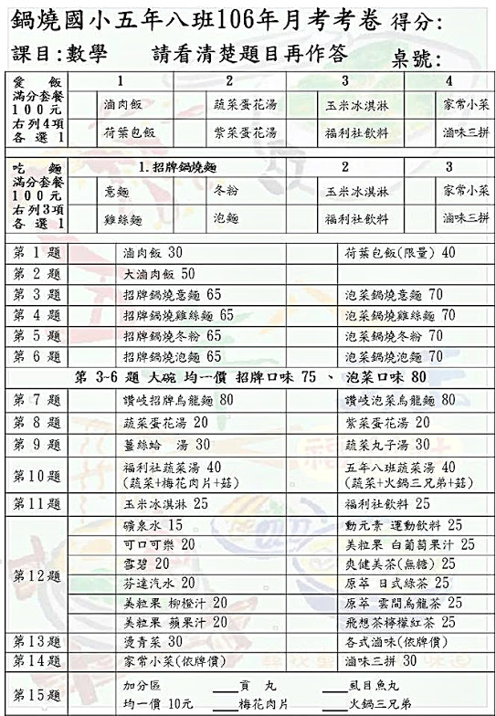 內用 請拿 數學 考卷、外帶 請拿 國語 考卷劃單點餐