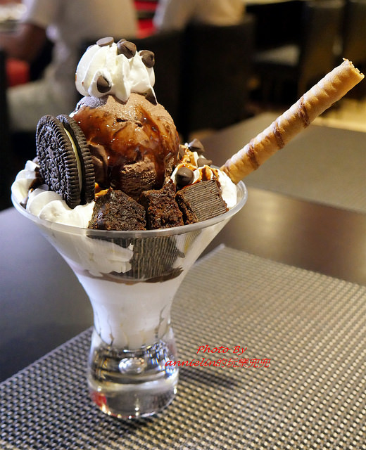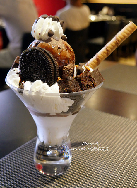 足足給兩大球巧克力冰淇淋,上面點綴了數塊的方磚布朗妮和奶油,