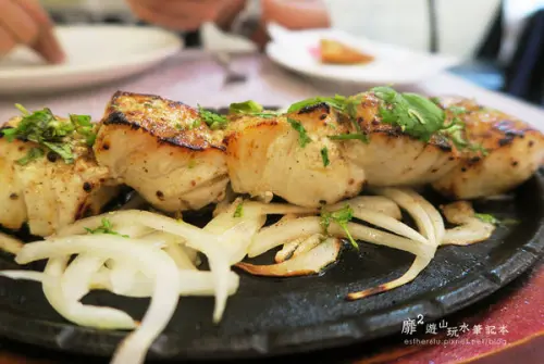 伴著熱的滋滋作響的鐵板上菜,魚被烤的表皮香脆(薄薄的一層烤香料的表皮)