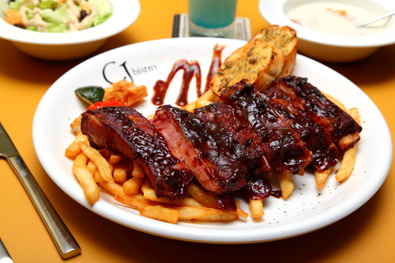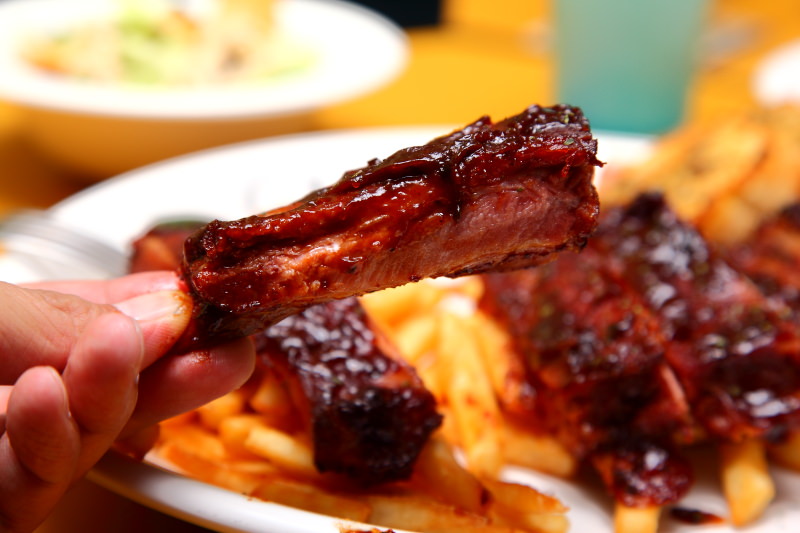 看看這多汁厚實的豬肋排肉質,吃美式豬肋排就是要豪邁,直接用手抓著吃,一口咬下豬肋排,嚇!這肉也太軟嫩了,事先醃漬過的豬肋排吃起來相當夠味,上面塗上鹹甜的美式燒烤醬,肉汁相當豐富,越是咀嚼豬肋排的油香氣及肉汁不斷在口中釋放,簡直可以媲美知名美式餐廳的豬肋排!必點!