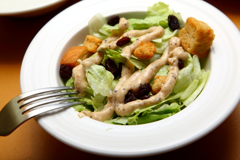 帶著鹹香滋味的凱撒醬均勻的包覆在蘿美生菜上,生菜吃起來相當爽脆,凱薩醬風味濃郁,撒上香酥麵包丁,富有層次口感