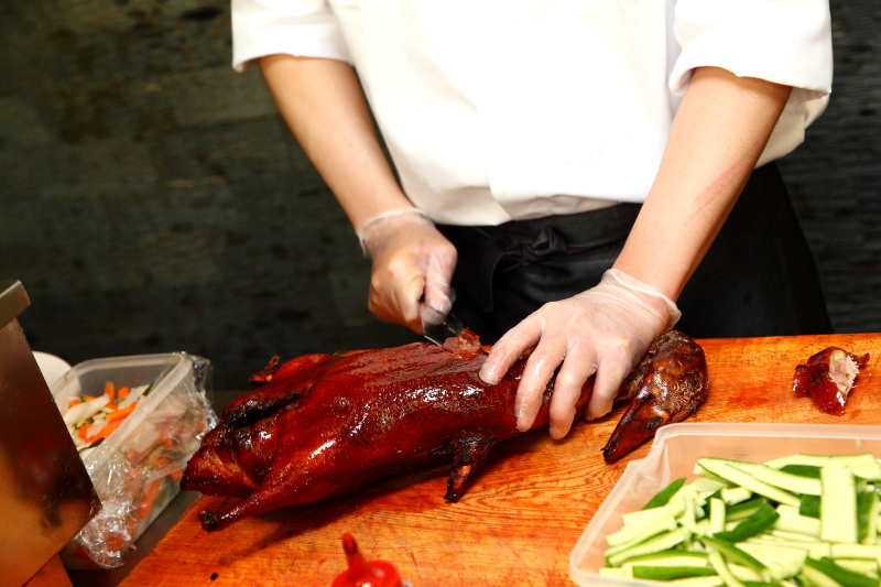叮叮叮!服務鈴再次響起,大家有志一同的集合到港式燒臘區排隊,因為金牌片皮鴨出爐啦!這可是廚窗港點超熱門的限時料理,油亮亮的烤鴨師傅當場現片,看著師傅片下鮮嫩的鴨肉,肉汁不斷的從切口泌出,超誘人的啦!