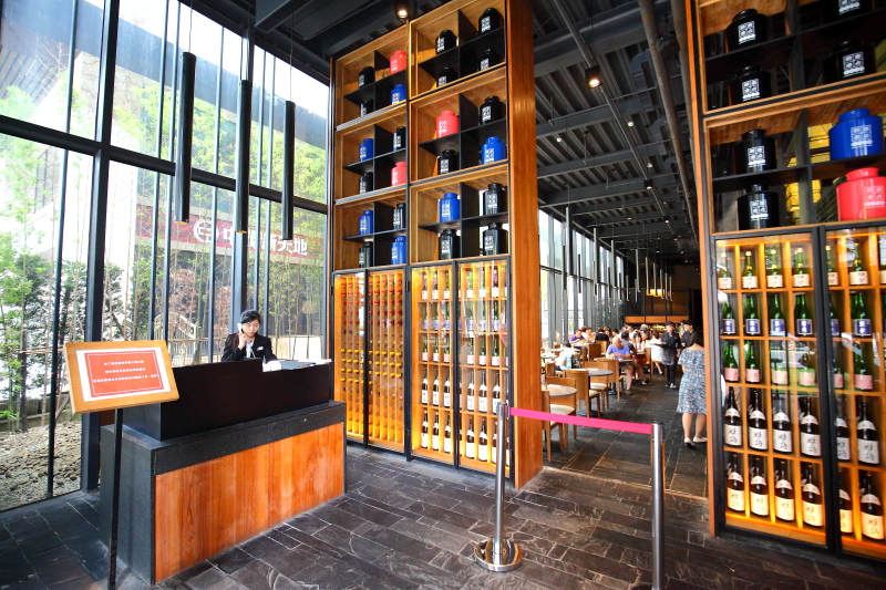 走進廚窗港點,色調依舊承襲高貴典雅的設計風格,超挑高空間,加上黑色與木質元素結合的沉穩裝潢,原本的清酒櫃上層的清酒變成一個個黑、藍、紅大茶罐,增添幾許港式風情