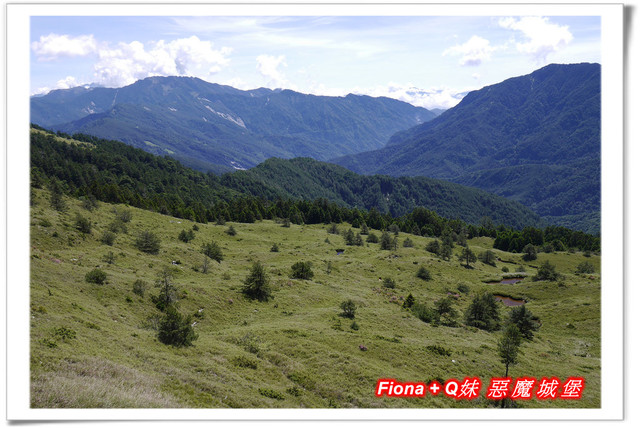 走上觀景台,看著眼前的風光,近處是一片淺綠的草地,中間還有兩座可愛的小池子,遠方則是深綠的連綿山峰,搭配上飄忽不定的白雲與碧海藍天,構成一幅優美的風景畫,合歡山的景致真是醉人 !