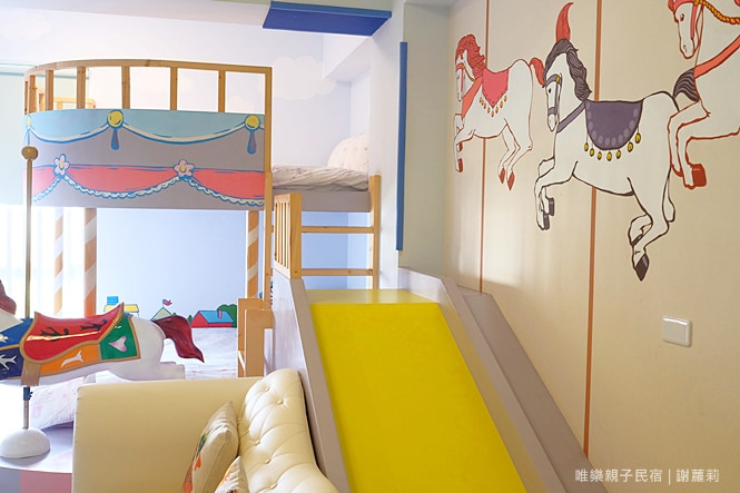 打開房門,整個房間都是我的遊樂園,我想這是我第一眼看到這風格時,腦海中唯一想得到的形容詞了吧!當下直覺得未免也太驚喜,睡覺的床舖就是個旋轉木馬,重點是那木馬還真的是可以乘坐旋轉的耶!