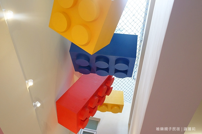 民宿的中央採空井式設計,白天就算不太開燈,也有絕佳的明亮採光,抬頭望,天花板上還頂著幾個大型的樂高積木當裝飾,真是太可愛了。