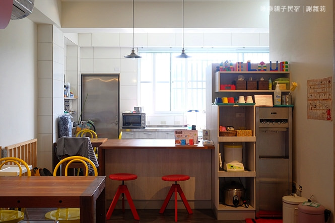 一樓大廳大致上規畫成幾個區堿,有剛才的高跟鞋遊戲區、決明子沙坑、交誼用餐區,而後面這邊則是私人廚房,廚房部份只限管家使用而無開放,不過若有需要清洗奶瓶餐具,這邊也有提供棉刷、清潔劑及奶瓶消毒鍋可以使用。