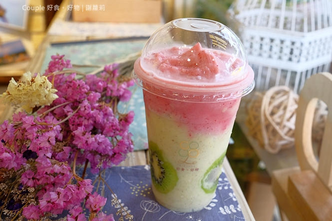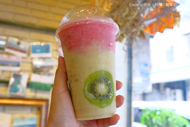 這邊的漸層果汁如果沒記錯,大概有二、三款,裡面就屬這杯從綠透出嬌嫩粉紅色調的顏色最吸引我囉!而且透明瓶身還可以瞧見那切成片狀的奇異果呦!外型看起來真的好可愛。