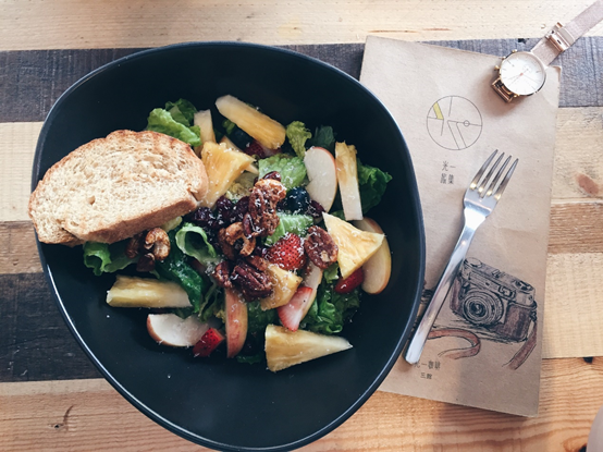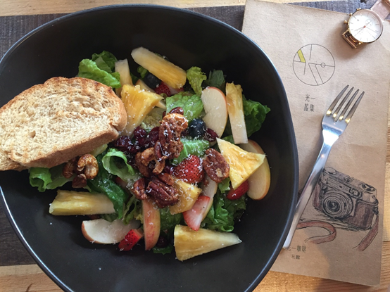 自製果香沙拉醬汁、肉桂綜合堅果、帕馬森起司、黑胡椒、麵包