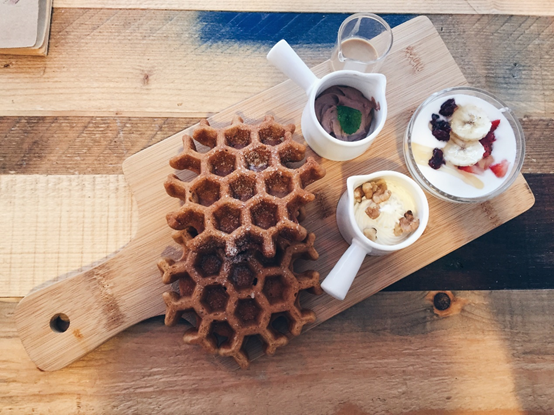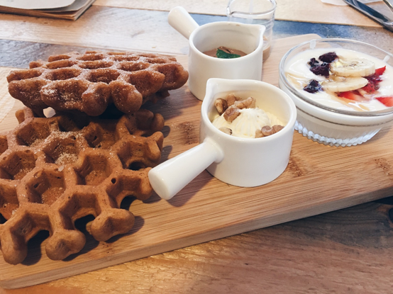 木頭砧板上揣著鬆餅2大片、還有水果優格