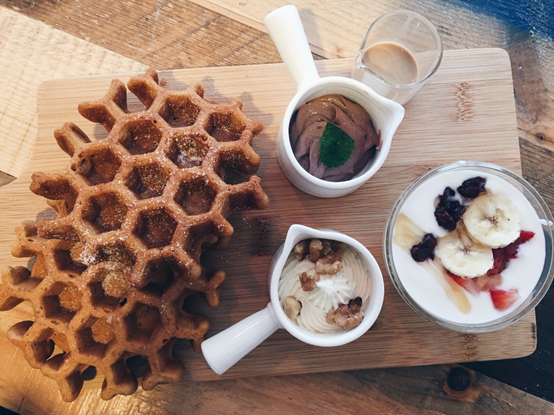鬆餅單吃就很香,再加上咖啡慕斯、奶油、咖啡奶精~各有不同口感,好吃!