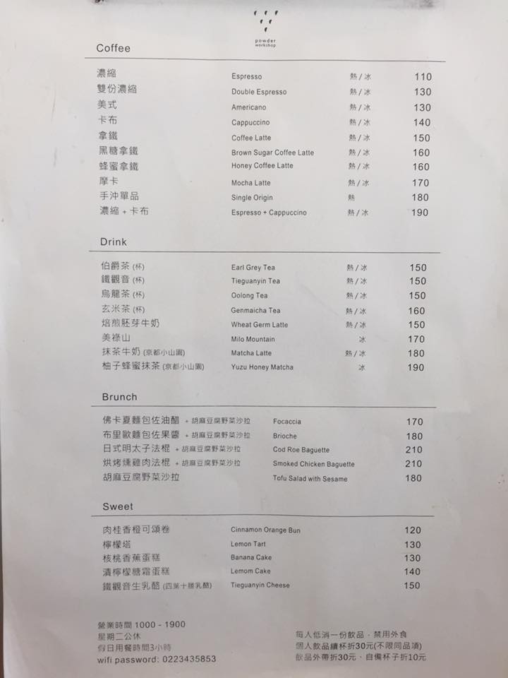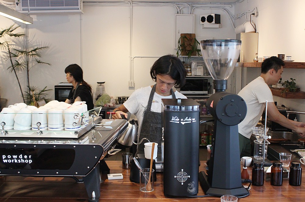 大部分店家名稱都是使用cafe,但Powder workshop卻以workshop來命名,原因是不想被定位是咖啡店或餐廳,只想成為供應自己所喜歡和推薦的餐飲給客人的工作室,而powder所代表的可以是麵粉和咖啡粉,正是製成咖啡、甜點以及麵包的主要元素。在Powder workshop真的有一種在很舒適的工作室用餐的氛圍,望著咖啡師有種靈感隨著咖啡粉落下的感覺,可惜當日沒帶筆電出門,沒能及時接住突如其來的文思泉湧。