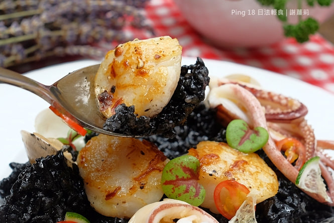 使用生食級的北海道干貝、花枝、蛤蠣,墨魚燉飯香氣十足,其中還綴點著另一股清爽的檸檬氣味。