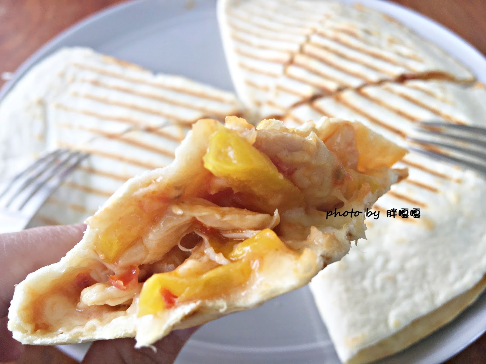 內層夾了大量雞肉、彩椒及起司