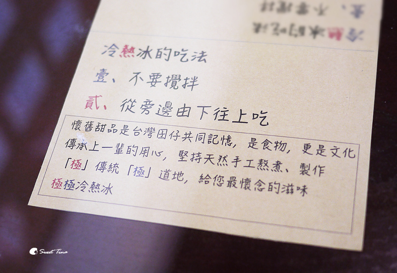 桌上還會特別附上冷熱冰的吃法,就是不要攪拌,從旁邊由下往上吃呢。