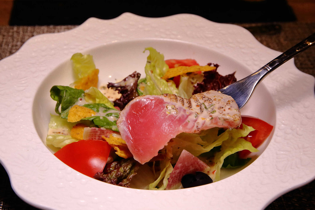 口感Q彈的鮪魚味道很鮮美,沾點特製醬汁,搭配新鮮生菜,同時享用雙重口感