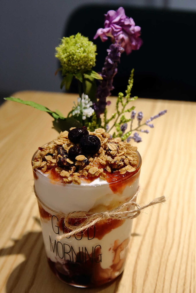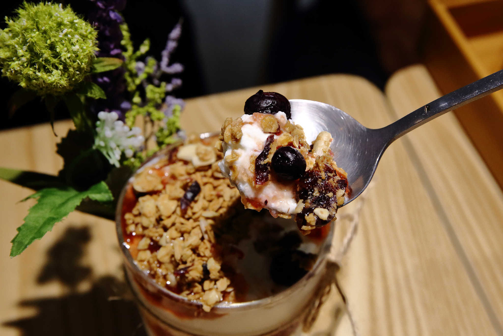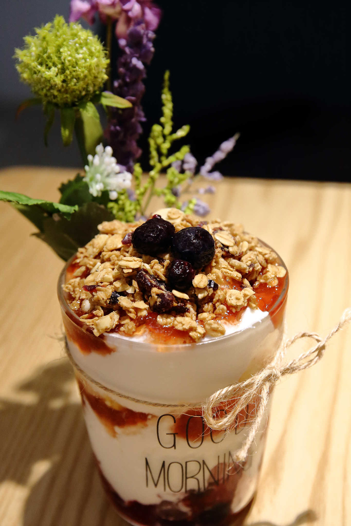 自製的低糖優格上鋪滿一層燕麥在草莓果醬上,不僅視覺上清新甜美,吃起來也有多種水果的自然