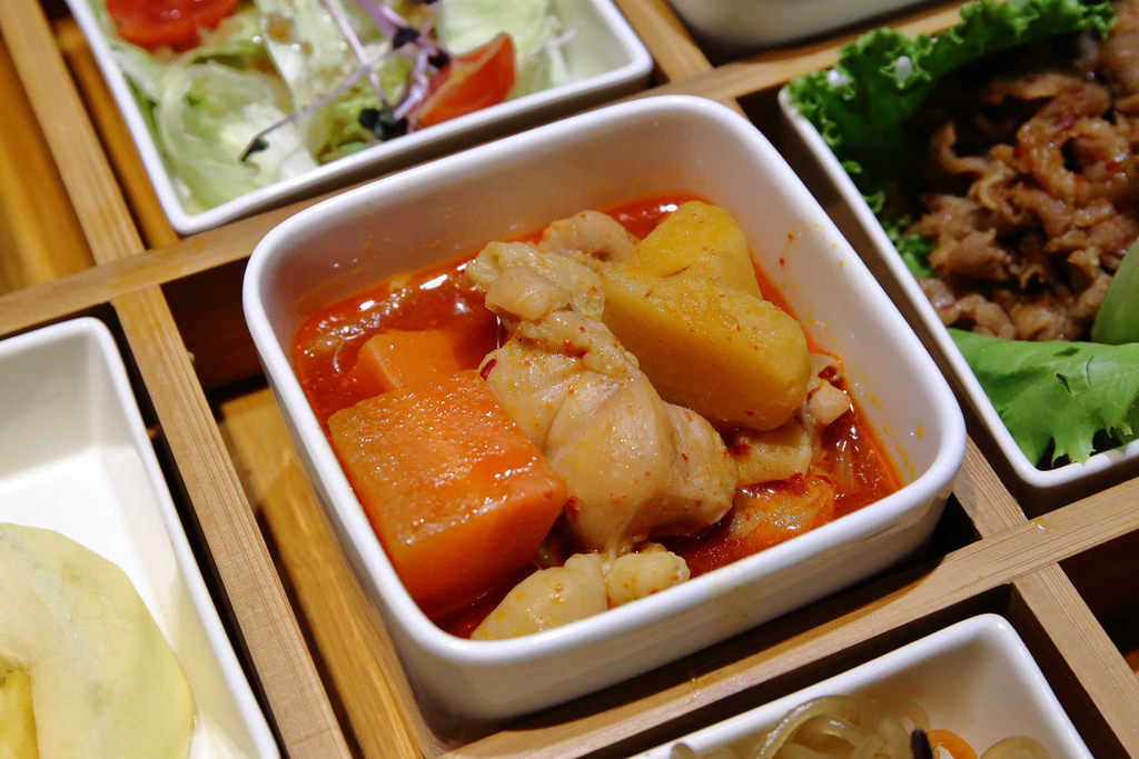 韓式辣燉雞,雞肉很軟嫩可口,還有溫和不刺激的辣味和馬鈴薯、紅蘿蔔的甜味很合, 讓人一直想多吃幾