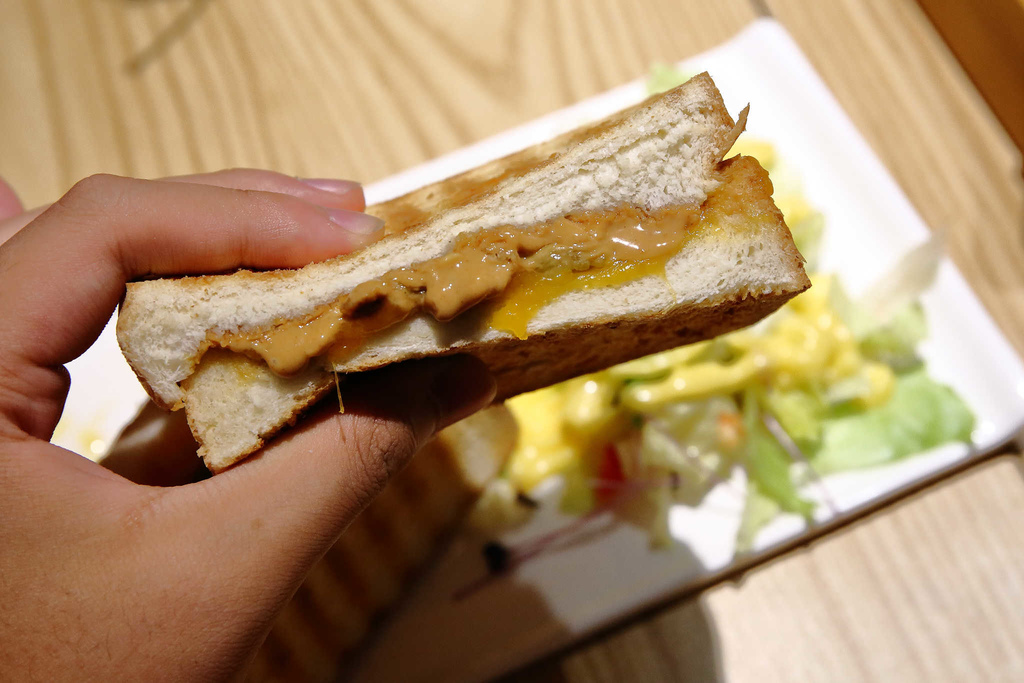 這份三明治最重要的主角就是濃厚花生醬與鹹香培根,這樣的餡料組合雖然熱量破表,但好好吃呀〜