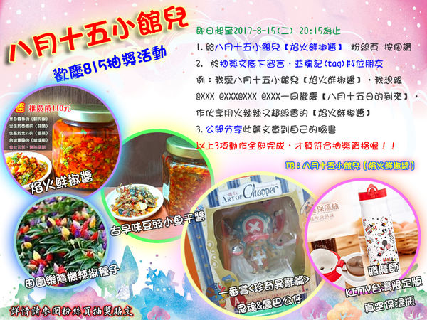 為了回饋人客兒,目前八月十五小館兒【焰火鮮椒醬】的粉絲頁,正舉辦歡慶815的活動~