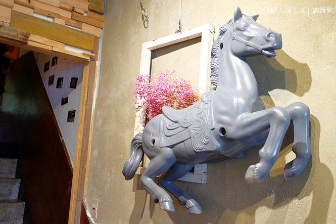 建築物是獨棟式的二層樓老宅,沿著樓梯信步而上,又有另一個不同風貌的小世界,是說這入口處的木馬就這樣懸掛在牆面上,體形碩大看似有些浮誇,卻又毫無圍和感地巧妙融合於空間裡。