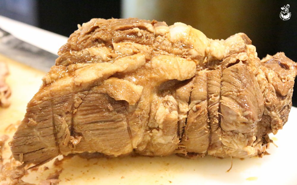 叉燒泡過了醬油產生了鹹、甜與肉汁鮮美的風味,梅花部位肉質Q彈,肥瘦適中,油脂度不會膩,肉浸泡在冷冷的湯頭裡油脂不噁心,別有一番風味(背景音樂:冷冷的湯頭~~在舌頭胡亂的拍~~♫)