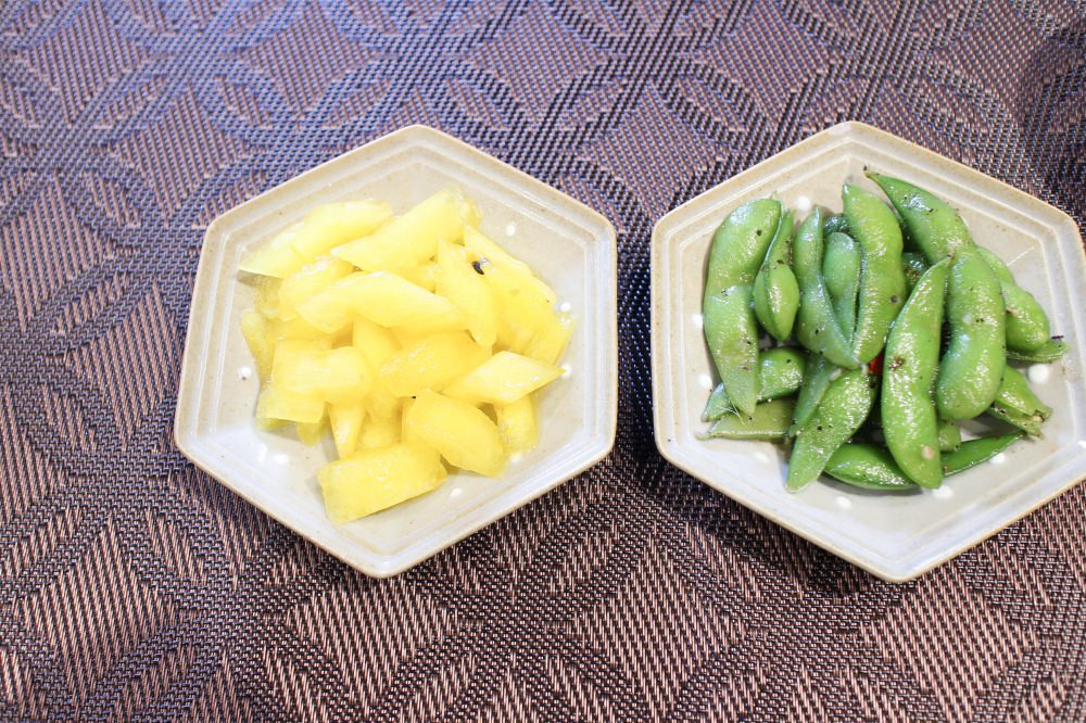 百香果漬冬瓜和毛豆都是常見的日式小菜,特別喜愛百香果漬冬瓜脆脆的口感,甜蜜的果香滋味,十分解膩