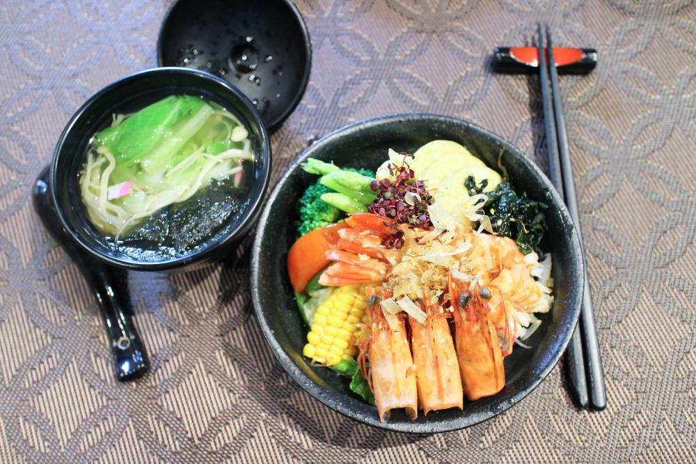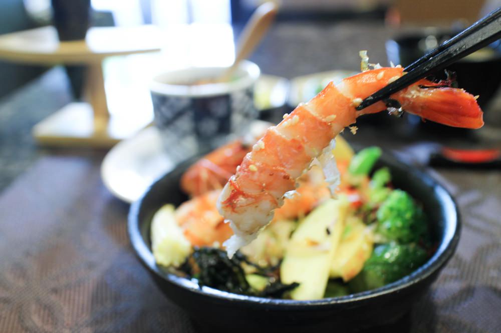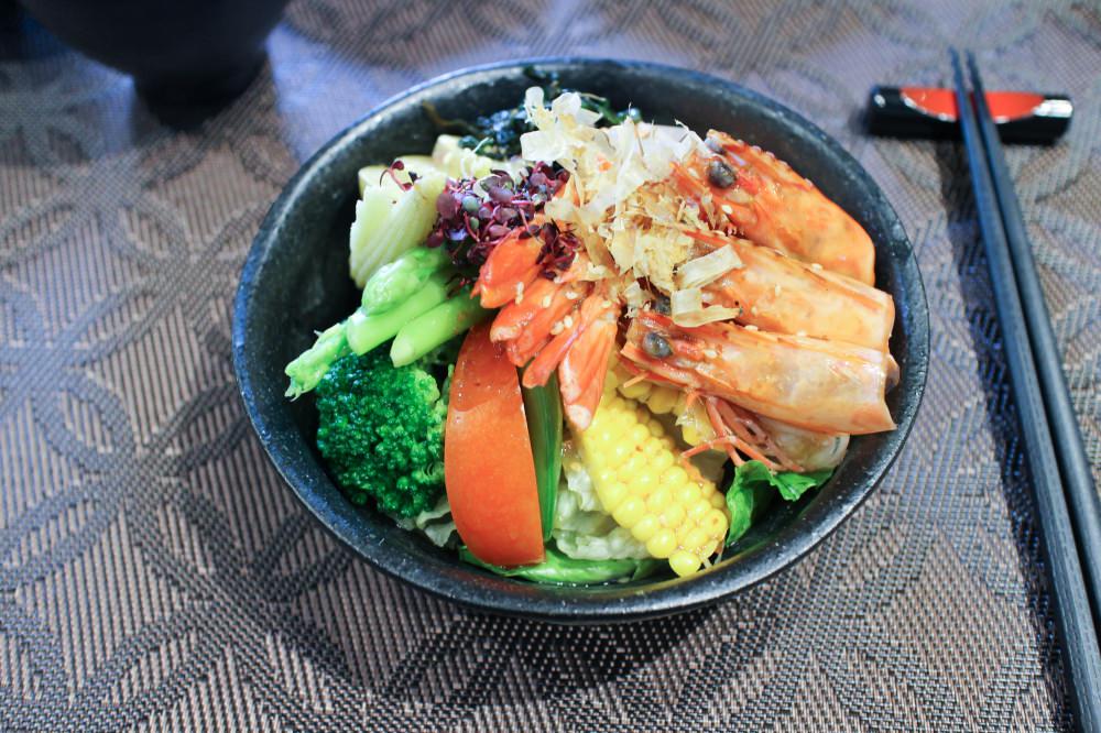 已經貼心去殼的三尾大蝦,蠻橫趴在沙拉最上頭,師傅保留蝦頭讓客人可以吸吮蝦膏,蝦子旁翩翩起舞的柴魚片,成為這碗沙拉非常強烈的提味作用,花椰菜、玉米、番茄和美生菜等等,讓這碗沙拉吃完時蔬和海味都滿足