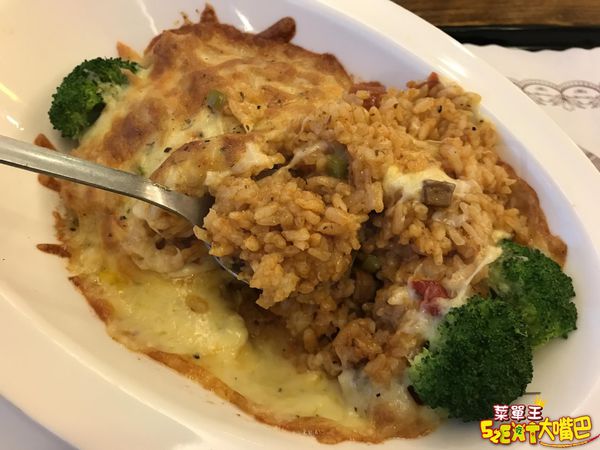 ▼南洋風味焗烤飯,加進了南洋香料與薑黃,吃起來風味十足,加上厚厚的起司焗烤之後更好吃了,南洋飯裡用料十足,青椒與彩椒還有香菇頭與花椰菜,小編非常喜歡!