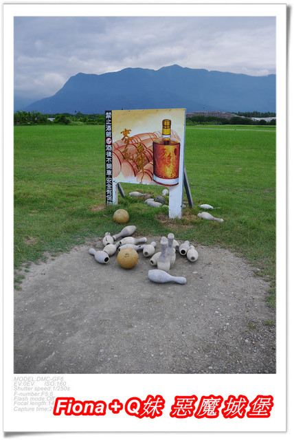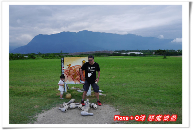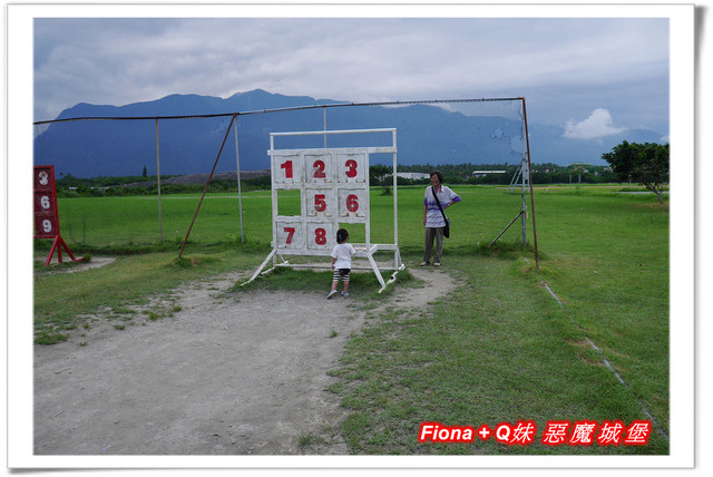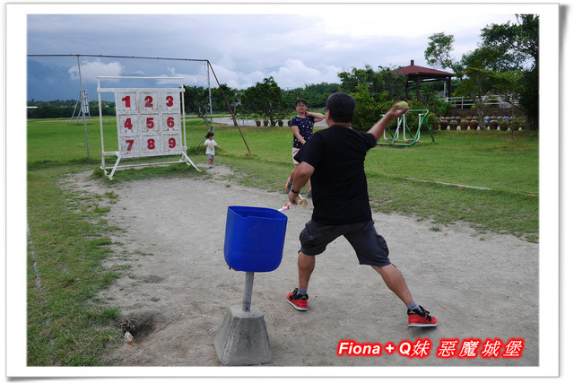步出展售中心,發現酒廠的戶外園區規劃的很不錯,一大片綠油油的草地上,設置了幾樣好玩的遊戲器材,一看到九宮格,父女三人馬上衝去大展身手,Q妹直接站在數字牌前面丟,不小心讓她丟倒了好幾個數字,開心極了 !
