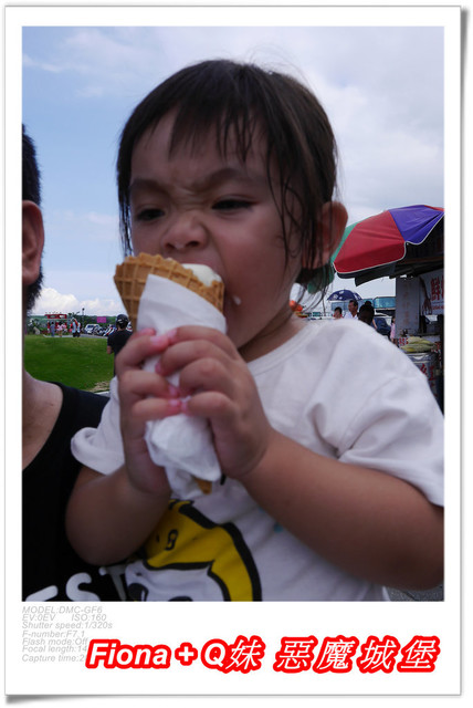 離開海邊,小叔在攤販區買了兩支冰淇淋給姊妹倆消暑,Q妹第一次可以自己吃這麼大一支冰,超開心,吃得滿臉都是,哈哈 !