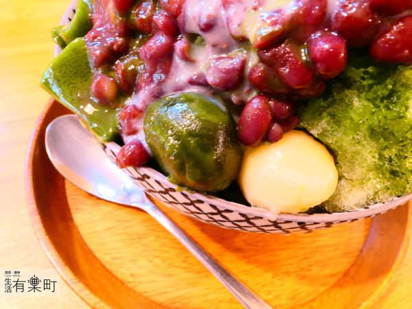 用砂糖熬煮過,帶出飽滿光澤與甜蜜口感的紅豆,搭配帶濃郁又微微苦澀的抹茶刨冰,超對味的呀。佐在一旁麻糬球也超Q彈的,不僅增加整碗冰的口感,採一綠一白的搭配也更添視覺色彩。