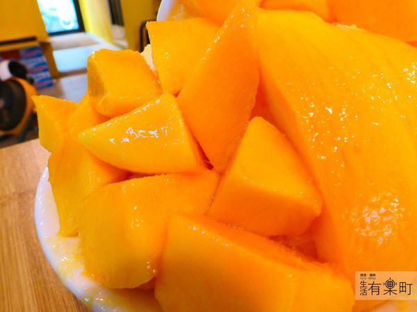 黃澄澄的芒果好大塊,有切塊芒果丁不意外,居然還有切成條狀的,單吃芒果就超過癮,整個很澎拜耶。