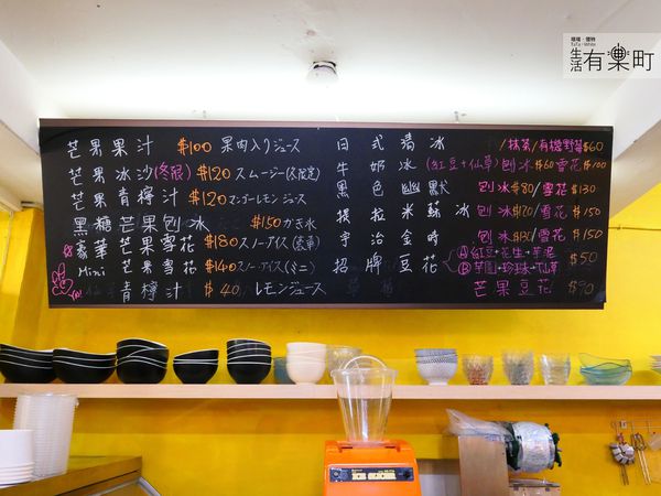 店內有低消,而且一個人要點一個品項。不過刨冰和雪花冰其實蠻大碗的,如果怕一人吃一碗冰吃不完,也可以點杯果汁來搭配。提供的品項有果汁、冰沙、豆花、宇治金時刨冰、芒果冰和雪花冰等等,選擇不算少。