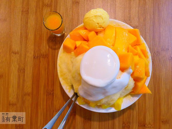 對了,豪華芒果雪花冰還有附上一盅芒果果醬~記得要從上面一口氣淋下去,然後左右平均淋,一開始我只淋一邊,結果因為太多還淋到桌上超糗(淚),淋上芒果果醬後。重點就是讓濃郁香甜的芒果果醬沾滿雪花冰,滋味會更好啦。