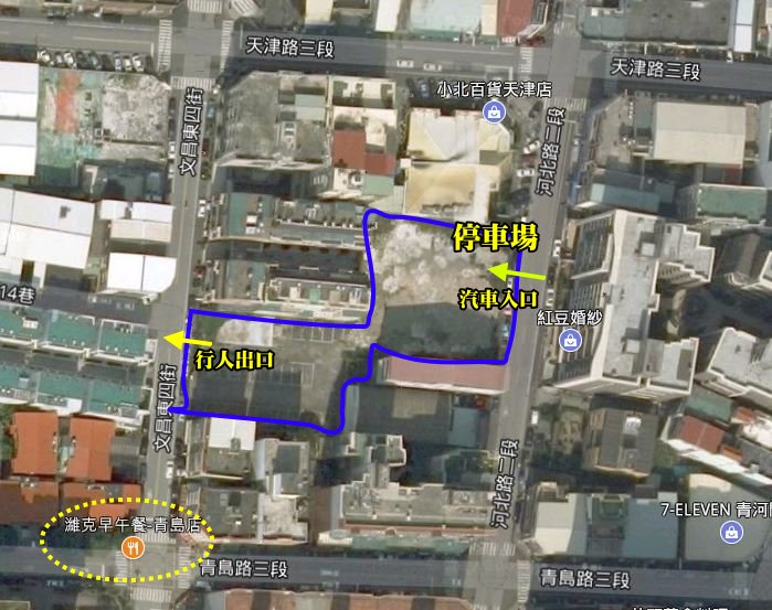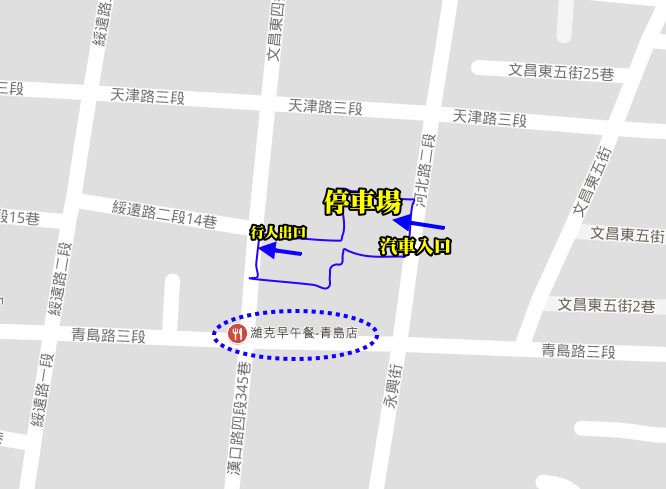 ▼停車場的入口從河北路二段進去,停好車後行人可以由文昌東四街的出口出入,距離「濰克早午餐」步行約1~2分鐘即可到達!