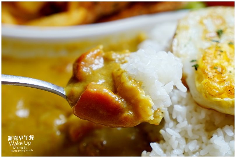 ▼濰克招牌咖哩飯(165元/主餐升級為嫩煎可樂雞柳另加10元),此外還有濰克招牌咖哩飯、生菜沙拉、荷包蛋、原味脆薯、現切水果等,這份量可說是一大盆來計算,連大口看了都覺得應該會吃不完XD
