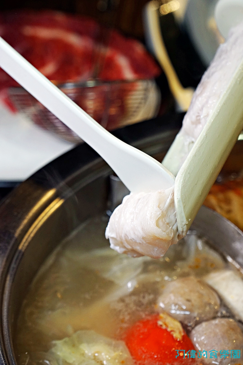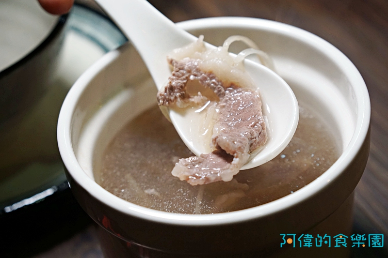 在吃火鍋之前,老闆先讓每人喝一碗溫體牛肉湯,身為台南人,對這樣的湯自然不陌生,於是當我喝一匙後,整個味蕾都被喚醒,有夠甜、有夠鮮的湯,完全沒有腥味,肉也好甜、好脆(彈Q),大家一致叫好。